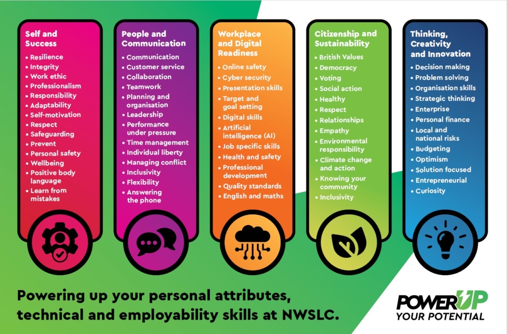 The initiative was partly shaped by conversations with employers, who emphasised the importance of helping learners develop wider attributes, such as communication and creative skills, that are essential in the workplace. In response, North Warwickshire and South Leicestershire College established five themes for ‘Power Up Your Potential’: Self and Success, People and Communication, Workplace and Digital Readiness, Citizenship and Sustainability, and Thinking, Creativity and Innovation. Each theme includes a list of important attributes designed to support students’ personal development, enhance their employability skills, and prepare them to succeed in their training, the workplace, and wider society.